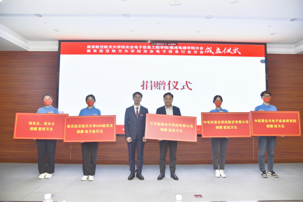 随后举行了捐赠仪式,潘时龙代表学院接受校友代表捐赠铭牌。杨先生、迟女士捐赠壹佰万元、江苏航泰电子科技有限公司捐赠柒拾万元、中电科思仪科技股份有限公司捐赠贰拾万元、成人网址 486级校友捐赠拾万叁仟元、中航雷达与电子设备研究院捐赠拾万元。06级院友、省妇儿基金会副理事长王华,继续支持了“结伴前行专项计划”奖学金壹佰万元。