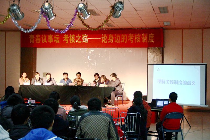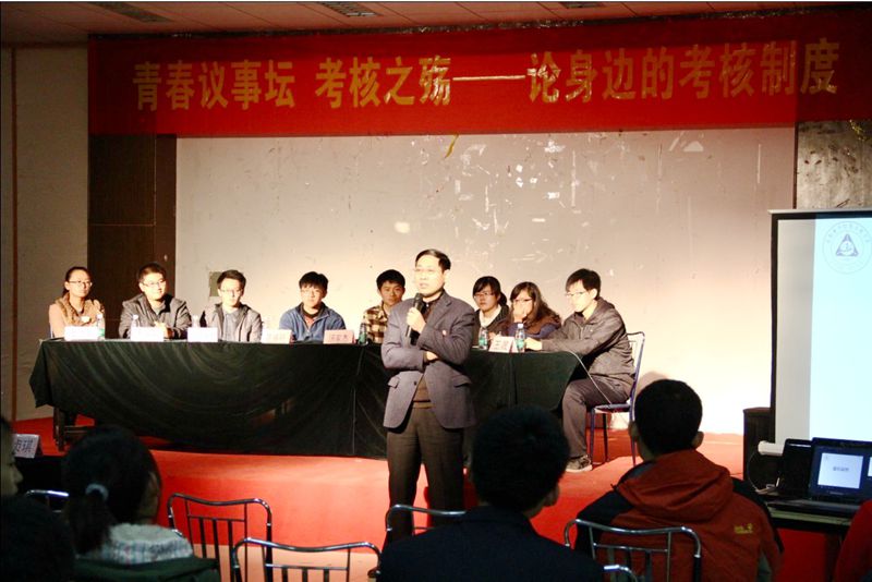 2013年11月28日下午16:00,由成人网址 团委主办的青春议事坛在将军路校区艺术中心二楼多功能厅召开,此次青春议事坛的议事主题是考核之殇——论身边的考核制度。参加此次青春议事坛活动的有成人网址 党委副书记季海群老师、13级辅导员周贞琪老师、来自成人网址 的八位才思敏捷的辩手以及全校范围内前来进行思想碰撞的学生们。