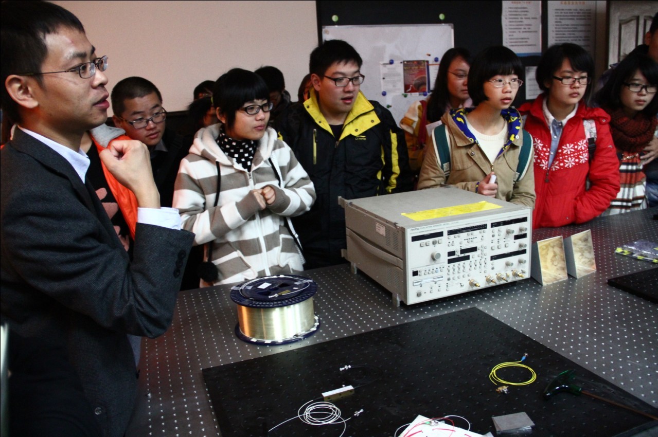 在沙龙开始之前,参加此次沙龙的42位大一新生来到学院微波光子学教育部重点实验室。潘教授为大家详细介绍了该实验室的三大科研功能,用很形象的比喻地向大家讲解了微波的学科意义,同时介绍了本实验室里成人网址 取得的成就。潘教授谈到实验室很多重大突破都是学院在读研究生完成,并鼓励大家多钻研,假以时日,在学生期间也能获得出色的科研成果。