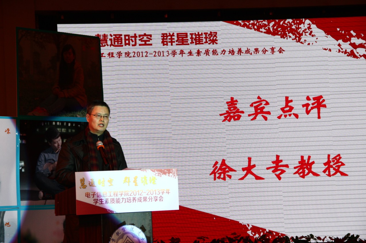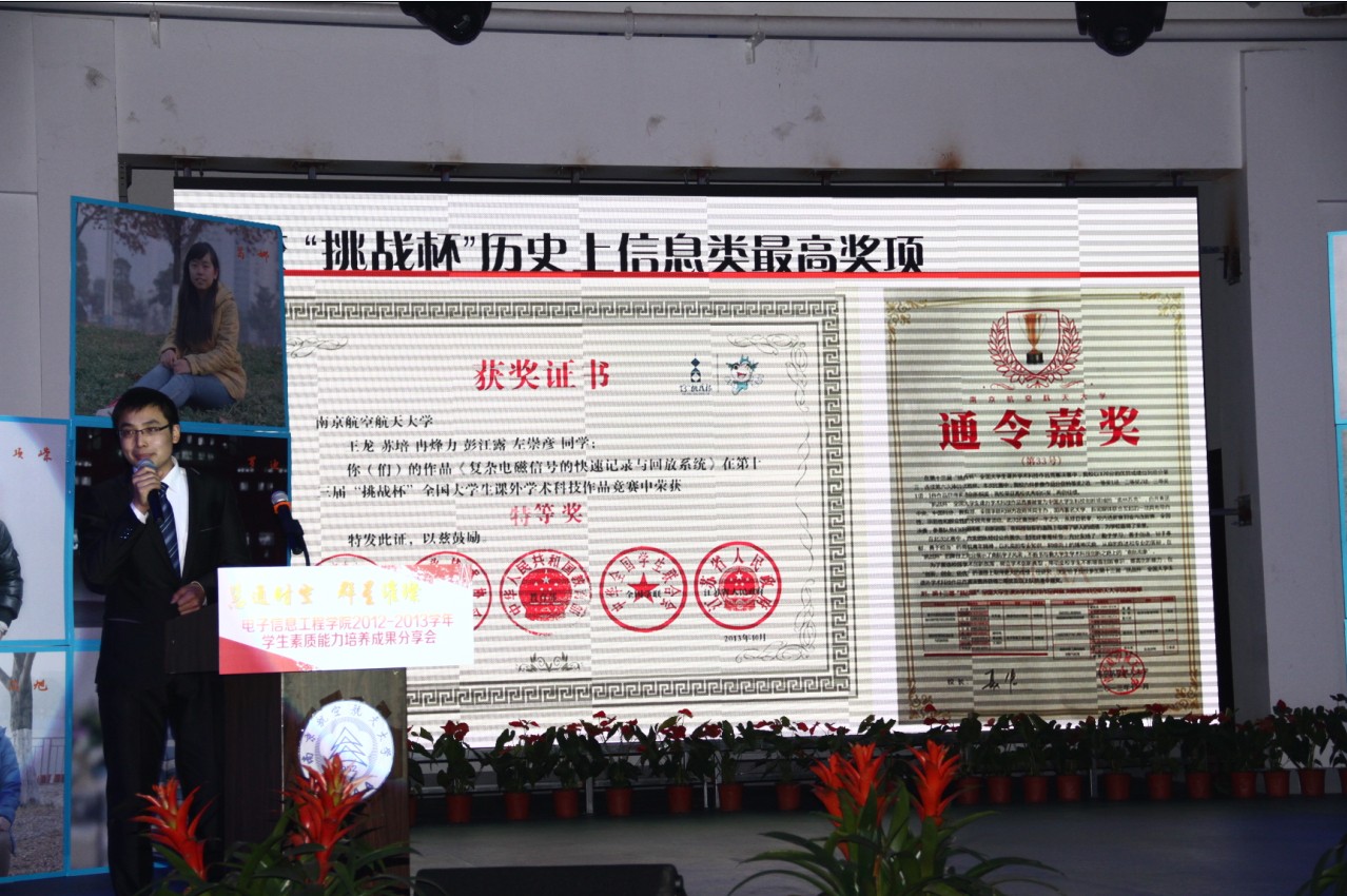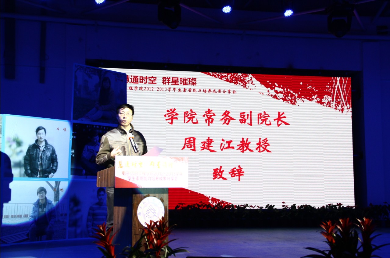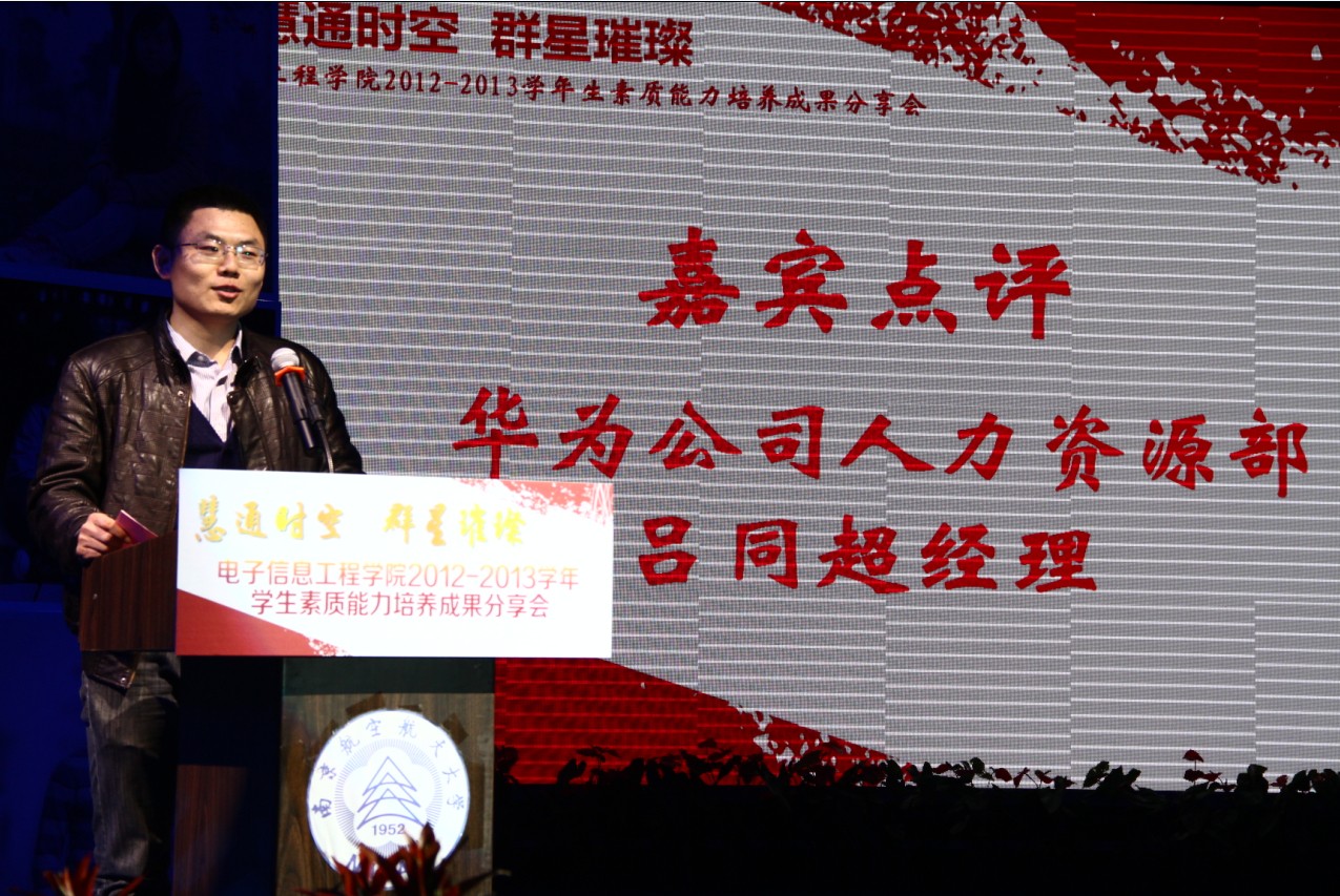 2013年12月11日晚,成人网址 “慧通时空,群星璀璨”2012-2013学年学生素质能力培养成果分享会在江宁校区大学生活动中心隆重举行。出席本次活动的主要嘉宾有:教务处处长王成华、校团委书记侍旭、华为南研所人力资源部招聘经理吕同超、学院党委书记冯绍红、常务副院长周建江、党委副书记季海群,副院长赵永久、刘少斌、张弓,参与此次活动的还有班主任、辅导员及近七百名本科生。