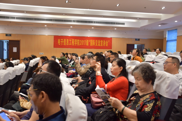 与此同时,2017级国际交流宣讲会也在学院515报告厅火热进行中。宣讲会由学院副院长雷磊老师主持,由国际教育学院副院长李勇老师主讲,李老师对国际交流项目进行了具体介绍,近百名家长对于国际交流有了新的认识和了解。当天下午,学院还为家长们精心准备了“礼赞新中国,唱响新时代”红歌会和素质能力悦享会,进一步展现学生的青春与活力。