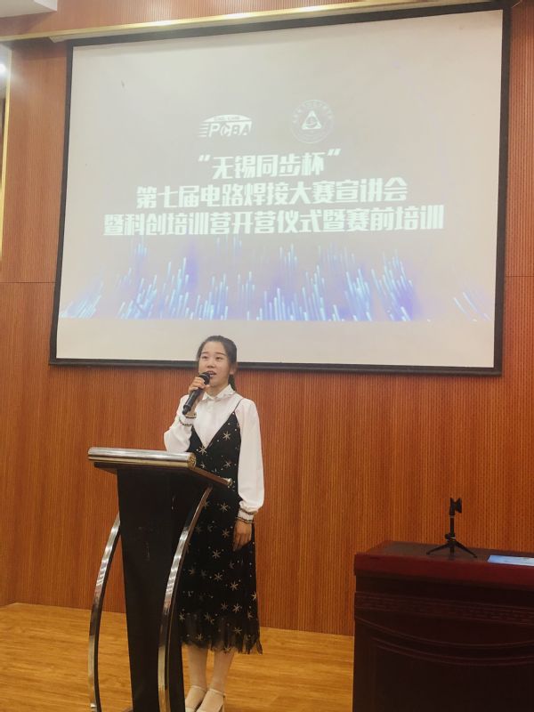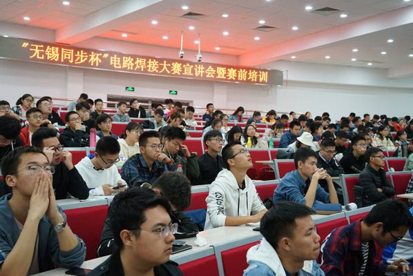2019年10月29日晚,由成人网址 举办的“无锡同步杯”第七届电路焊接大赛暨科创培训营开营仪式在将军路校区2110教室举行。参加本次活动的有无锡同步公司的人力资源部经理刘进军先生、工艺工程师杨坤先生、人力资源专员何丽丽女士、成人网址 团委徐艳惠老师和来自全校各个学院的400余名同学。