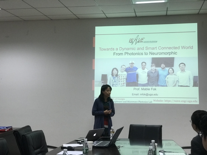 讨论中,Mable Fok博士主要概述了光子学在其他不同学科中的优势与应用,其中重点介绍了微波光子技术在动态异构多频带通信,逐点频谱整形,频谱共存全双工系统以及在非协调通信中的应用。报告持续了约一个小时,汇报期间,与会师生积极提问,与Mable Fok副教授进行了充分的交流与讨论。报告结束后,Mable Fok副教授参观了微波光子实验室,并与OSA协会成人网址
