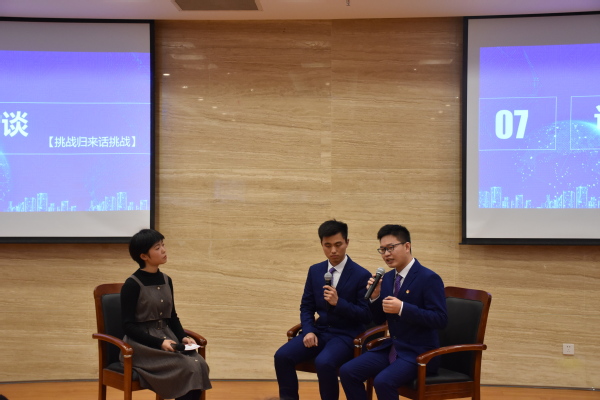 随后,学院优秀科创代表卿婷分享了自己的参赛经历与成长历程。学院科协工作人员向来宾介绍了本院举办的特色科创活动,进行赛事推介。张浩和黄振炎同学则分别介绍了他们参加2019年“挑战杯“全国大学生课外学术科技作品竞赛获特等奖和二等奖的竞赛作品。紧接着进入“挑战归来话挑战”环节,张浩和黄振炎通过访谈形式,将自己参与2019年“挑战杯“全国大学生课外学术科技作品竞赛过程的心路历程与在场同学进行分享,鼓励学弟学妹们参与科创,勇于创新。