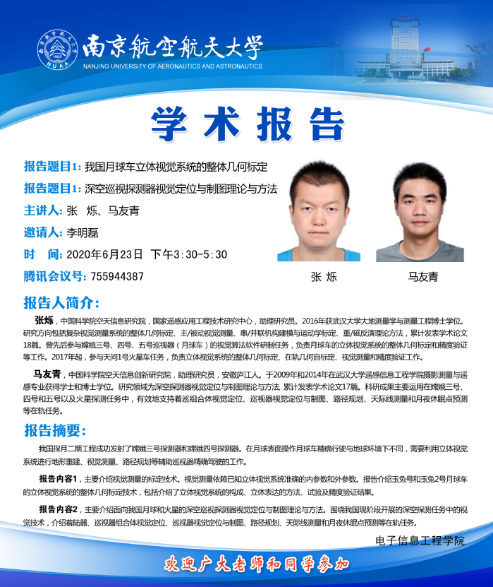 学术报告会——我国月球车立体视觉系统的整体几何标定;深空巡视探测器视觉定位与制图理论与方法