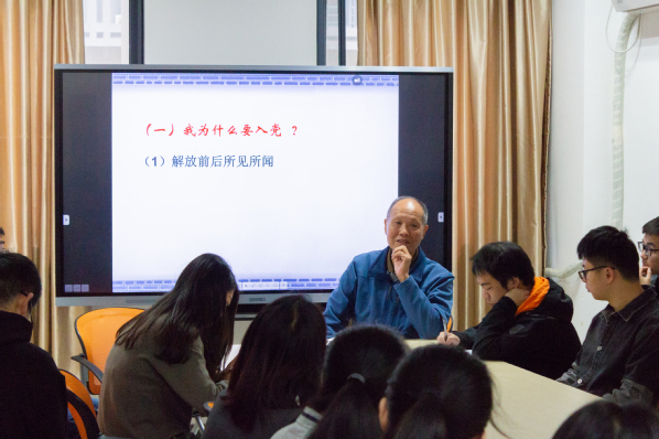 党课伊始,戴明桢从自己的成长过程说起,结合所接受的革命传统教育,分享自己的入党动机,并向同学们讲述了解放前后自己的所见所闻。他高度赞赏解放军的高尚品质并指出,坚定的革命信仰是共产党永葆先进的重要原因,以此深情嘱咐党员同志们坚定理想信念,不忘共产党人的初心与使命。