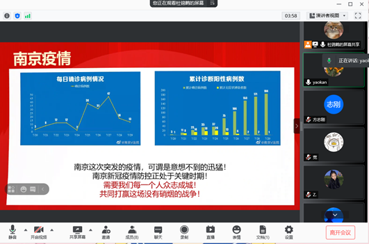 疫情伊始,为发挥一位党员就是一面旗帜的先锋模范作用,各研究生党支部集体开展 “肆E先锋、抗疫有我”主题党日活动,在支部书记及支委牵头下交流近期疫情更新情况和全市当前抗疫成果,引导广大党员同志强化抗疫主人翁精神,提高大家疫情防控管理意识,为维护和谐稳定的校园环境,动员研究生党员投身志愿服务做好思想基础。