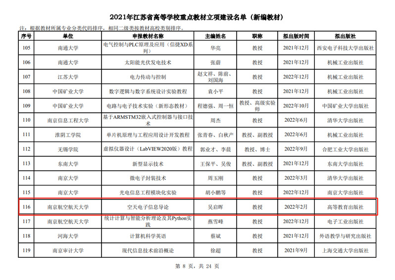 近日,江苏省高等教育学会公布了2021年江苏省高等学校重点教材立项建设名单(苏高教会〔2021〕39号),成人网址 由吴启晖教授牵头新编的《空天电子信息导论》教材获批省重点教材立项。