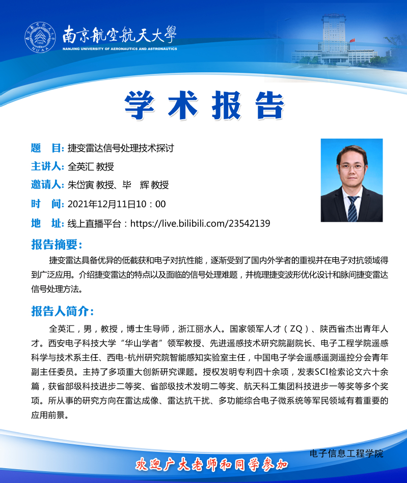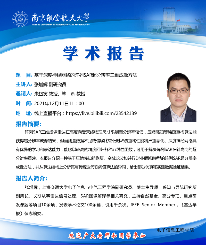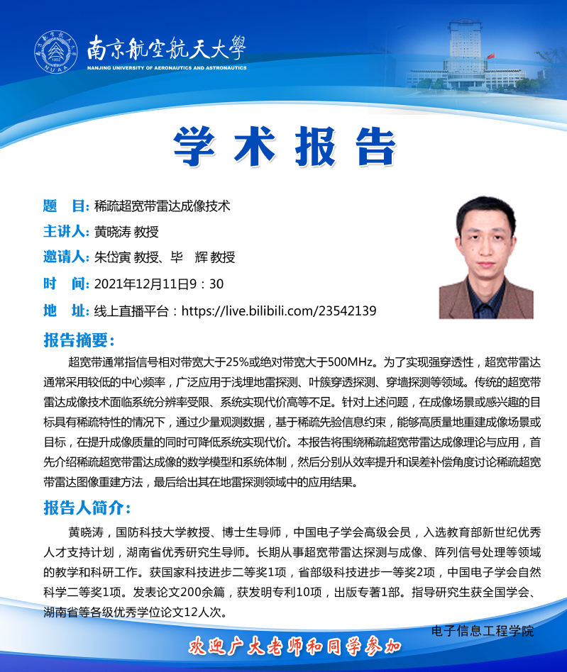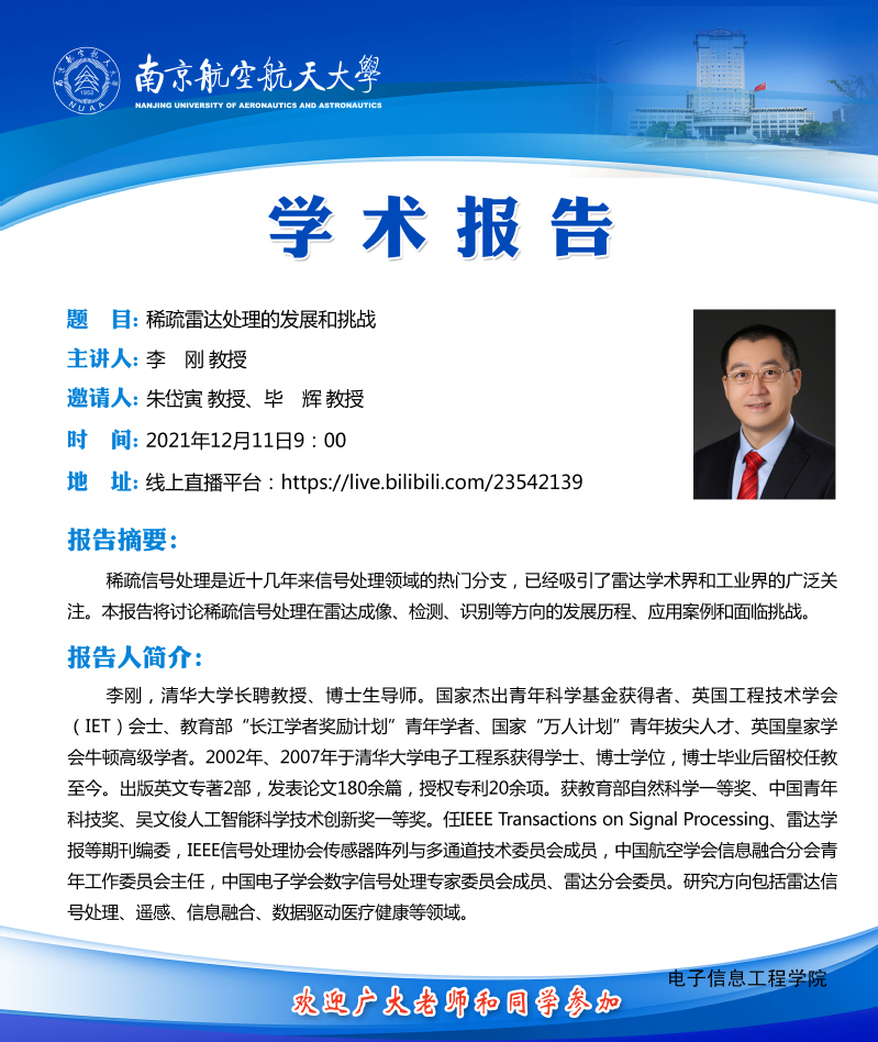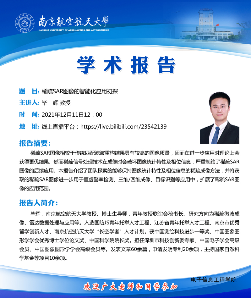 由成人网址 雷达成像与微波光子教育部重点实验室主办的“第二期雷达学报学术讲堂──当稀疏信号处理技术遇见雷达研讨会”将于2021年12月11日在线上举办。