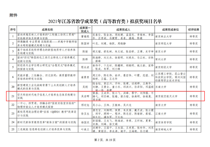 近日,江苏省教育厅公布了2021年江苏省教学成果奖(高等教育类)获奖项目名单,成人网址 报送的教学成果“空天科技时代电子信息人才培养生态体系构建与实践”荣获江苏省教学成果奖特等奖。