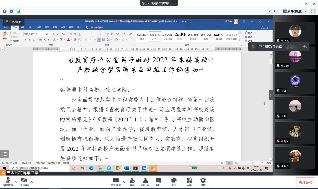 接下来,主持人邱旦峰老师及负责申报书各部分撰写的老师们针对已经形成的初稿进行详细的整体梳理,在此过程中,吴启晖教授针对各部分存在的问题以及可以提升的方面提出了多处建设性的指导建议,包括冗余内容的删减,必要素材的增加,以及特色方面的突出等;强调突出空天信息特色,形成产教融合的生态链的主线。