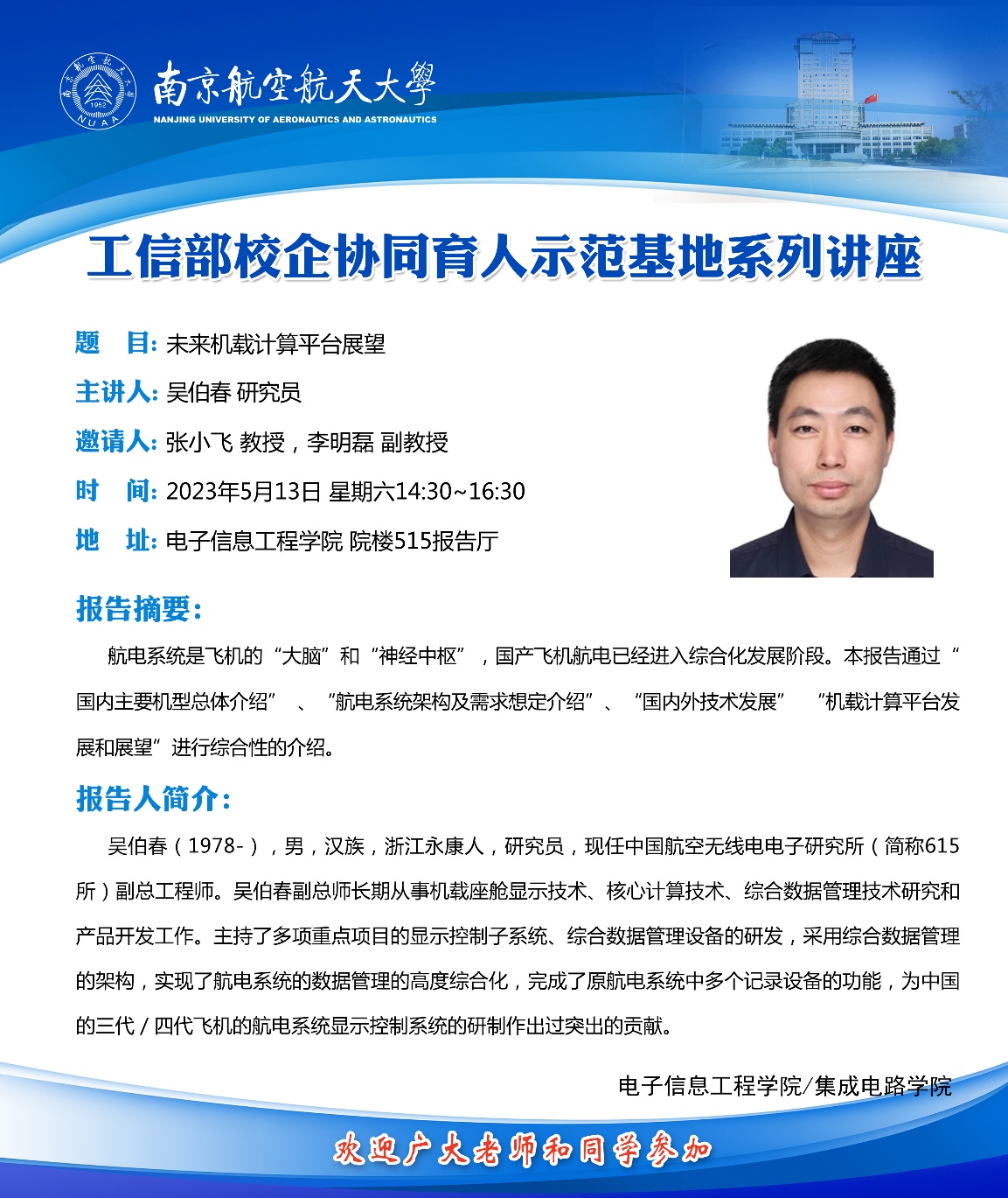 2023年5月13日,中国航空无线电电子研究所(简称615所)吴伯春研究员受邀来我校成人网址 /集成电路学院做题为“未来机载计算平台展望”的专题讲座。