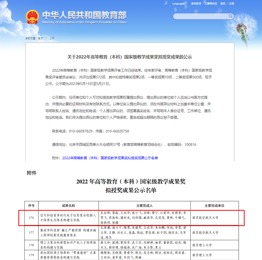 近日,教育部官网公示了2022年高等教育(本科)国家级教学成果奖拟授奖成果名单,成人网址 /集成电路学院报送的教学成果“空天科技竞争时代电子信息复合创新人才培养生态体系构建与实践”荣获国家级教学成果奖二等奖。