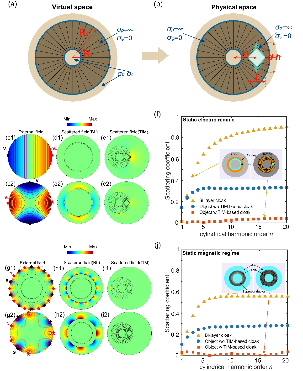 变换光学通过将材料的介电常数和磁导率与空间坐标变换关联,能够精确操控电磁波,从而实现隐身衣、透镜、光束调控等功能。隐身衣作为变换光学与超材料的典型应用,已引起了广泛关注。经过多年研究,隐身衣的应用领域已从光学和声学扩展至静电学、热扩散等多个领域。然而,隐身衣的实际应用面临着一个重要难题——具有强烈的背景依赖性。迄今为止,所有已实现的超材料无源隐身衣都只能工作于单一背景环境。这一问题显著限制了其广泛应用。为了解决这一问题,本研究基于静态场系统中的TIM概念,提出了一个创新性的解决方案。研究表明,通过巧妙设计的TIM,可以实现适用于任意背景环境的完美隐身衣。同时,这种新型设计方法适用于任意满足拉普拉斯方程的物理场,包括静电场,静磁场,以及扩散场等。