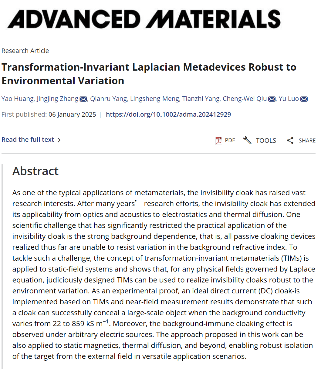 近日,我校成人网址 (天元实验室)罗宇教授团队联合新加坡国立大学仇成伟教授,以及东南大学张婧婧教授课题组,在《Advanced Materials》上发表题为“Transformation-Invariant Laplacian Metadevices Robust to Environmental Variation”的学术论文。该研究提出并实验实现了一种基于强各向异性超材料(TIM)的隐形技术,成功克服了传统隐身技术在复杂环境中面临的关键挑战,为隐身斗篷技术的实际应用提供了全新的思路。实验室罗宇教授为第一通讯作者,成人网址 为第一通讯单位。