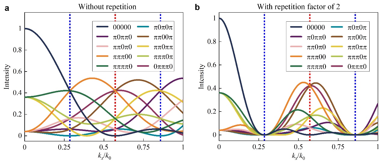 图2|不同编码序列在非周期编码与周期编码情况下所对应的远场方向图