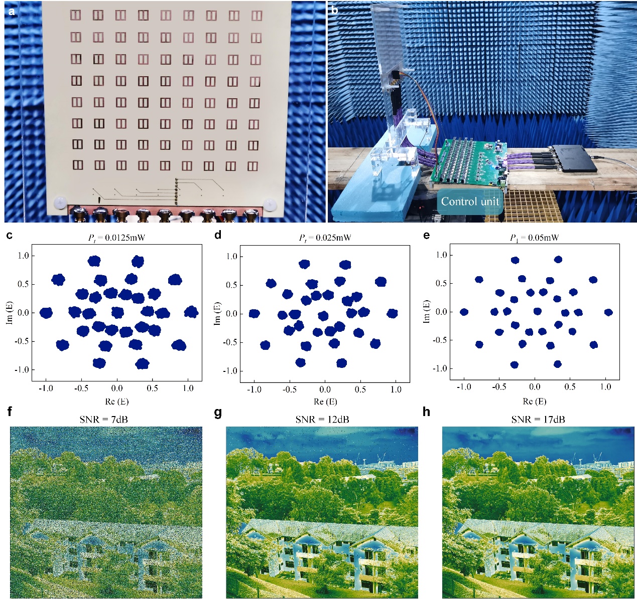 图3|基于可编程超表面天线的信息映射实验测量结果和基于该模型的仿真数据传输; a-b,可编程超表面天线与其集成控制单元的实物照片;c-e,在一阶谐波方向,通过实验获得的星座图,超表面天线输入功率分别为0.0125 mW(d)、0.025 mW(e)和0.05 mW(f);f-h,利用仿真实验,分别在SNR=7 dB(d)、12 dB(e)和17 dB(f)的条件下得到的传输图像质量。