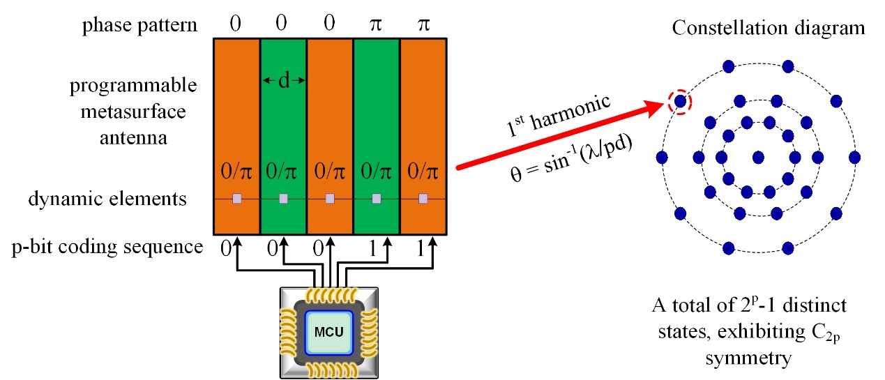 为了验证该技术的实际性能,研究团队设计并制造了一个1比特相位调制的可编程超表面天线原型。该超表面由二维阵列组成,每一列通过PIN二极管实现相位状态的切换。实验结果表明,该超表面能够在一阶谐波方向上生成31个独特的远场响应状态,且这些状态在星座图中呈现出对称分布,与理论预测一致。