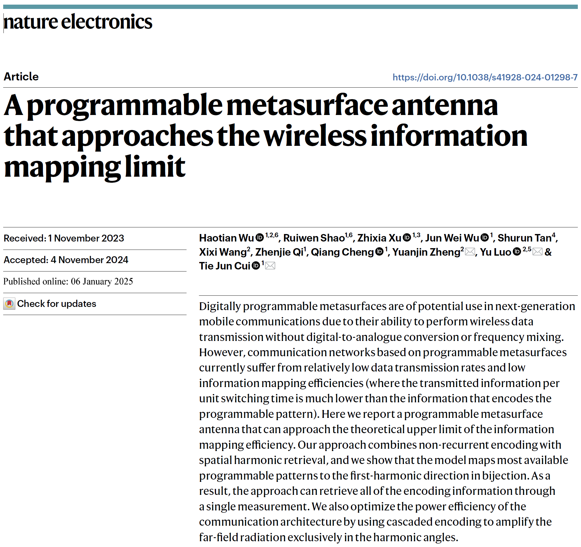 近日,我校成人网址 罗宇教授团队联合东南大学崔铁军院士和新加坡南洋理工大学郑元谨教授在《Nature Electronics》上发表了一项突破性研究成果,提出了一种接近信息映射效率理论上限的可编程超表面天线。该技术通过非周期编码和空间谐波测量,实现了高效的信息映射,为下一代移动通信技术的发展提供了新的可能性。崔铁军院士、罗宇教授和郑元谨教授为该论文的通讯作者;东南大学博士毕业生吴浩天(现任南洋理工大学博士后研究员)和东南大学博士生邵睿文为论文的共同第一作者。