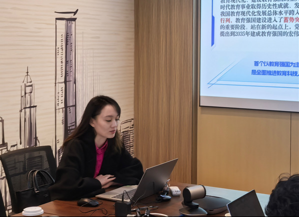 交流伊始,学院辅导员杨珂珂领学《教育强国建设规划纲要(2024年-2035年)》,重点阐述了该纲要的出台背景、主要内容并结合学生工作分享学习心得。