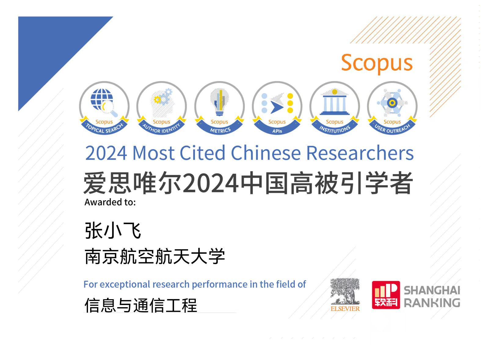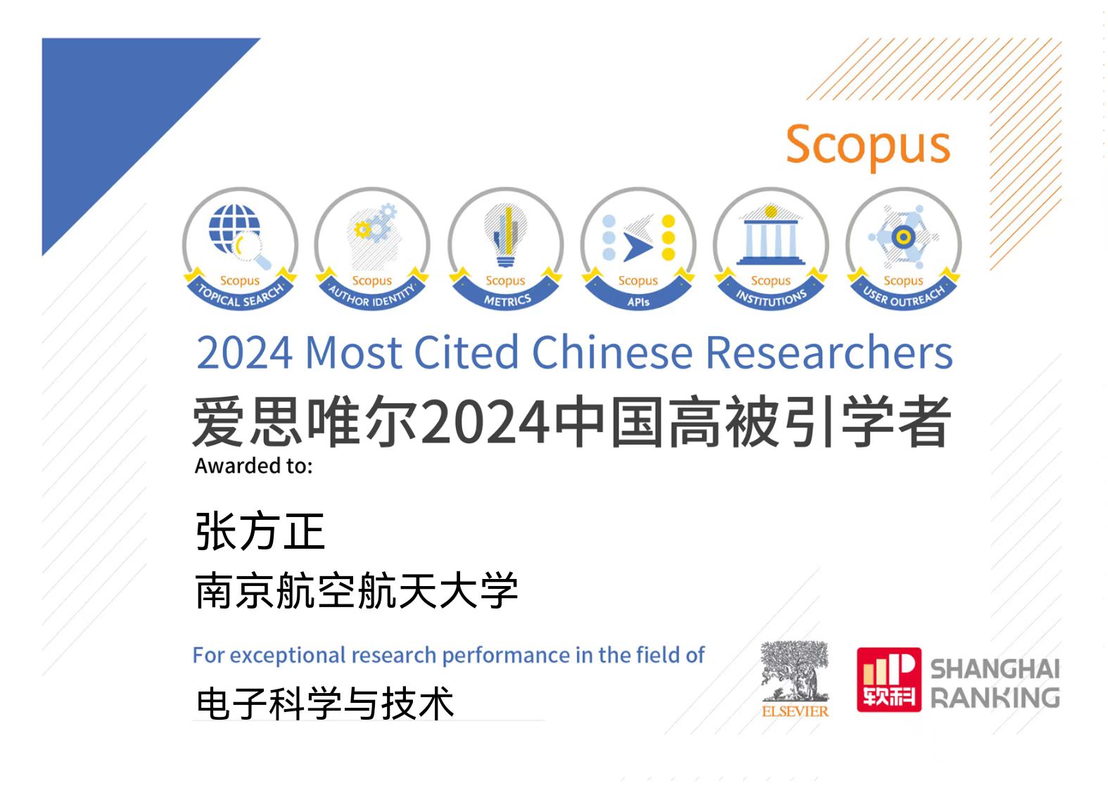 2025年3月25日,爱思唯尔(Elsevier)正式发布2024“中国高被引学者”(Highly Cited Chinese Researchers)年度榜单,该榜单覆盖了教育部10个学科领域、83个一级学科,介绍了6388名各学科最具全球影响力的中国学者。南京航空航天大学共有31位学者上榜,其中,电子信息工程学院潘时龙、张小飞两位教授继2020年以来连续第五年入选“信息与通信工程”学科领域榜单,张方正教授首次入选“电子科学与技术”学科领域榜单,也是学院首位入选“电子科学与技术”学科领域榜单的老师。