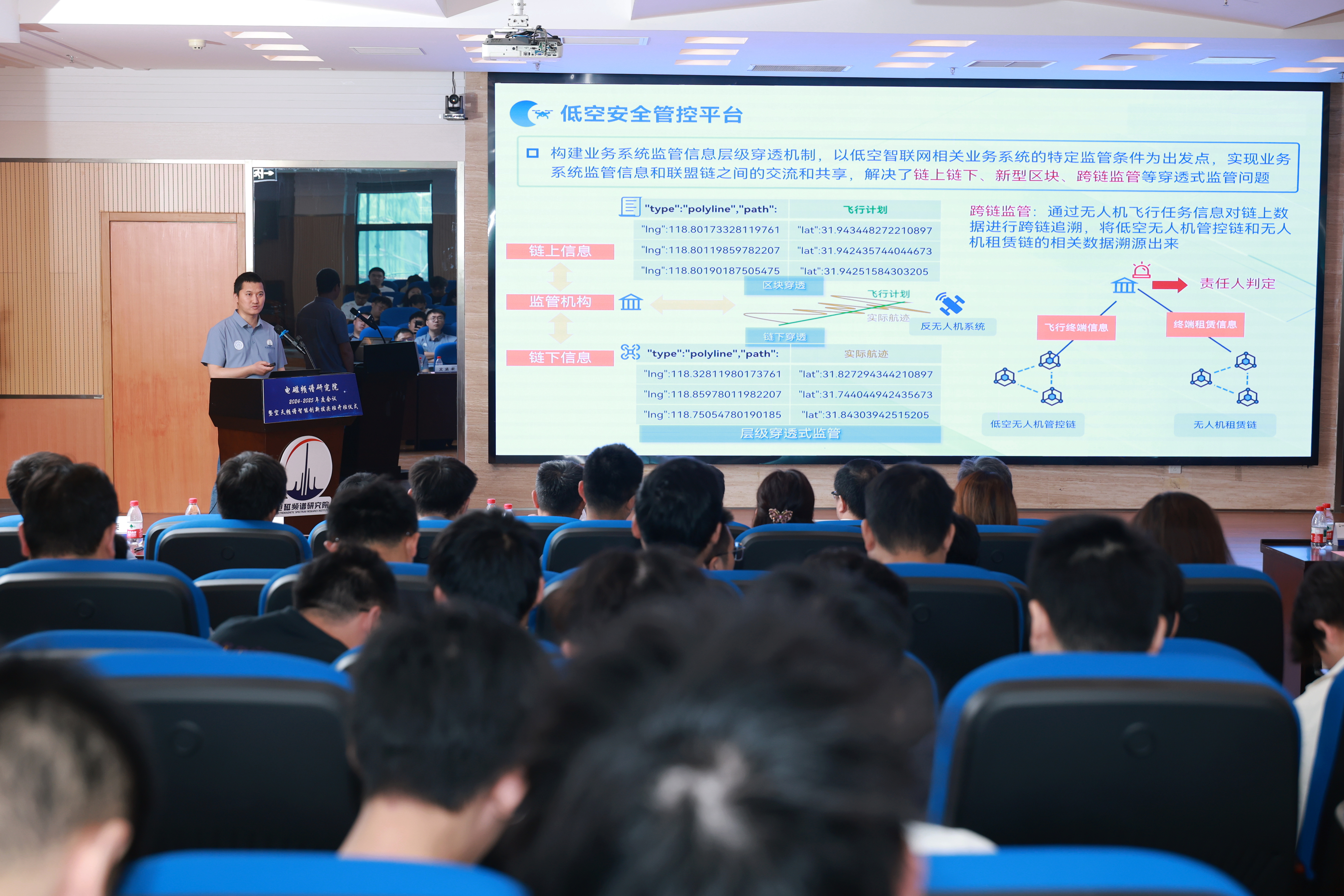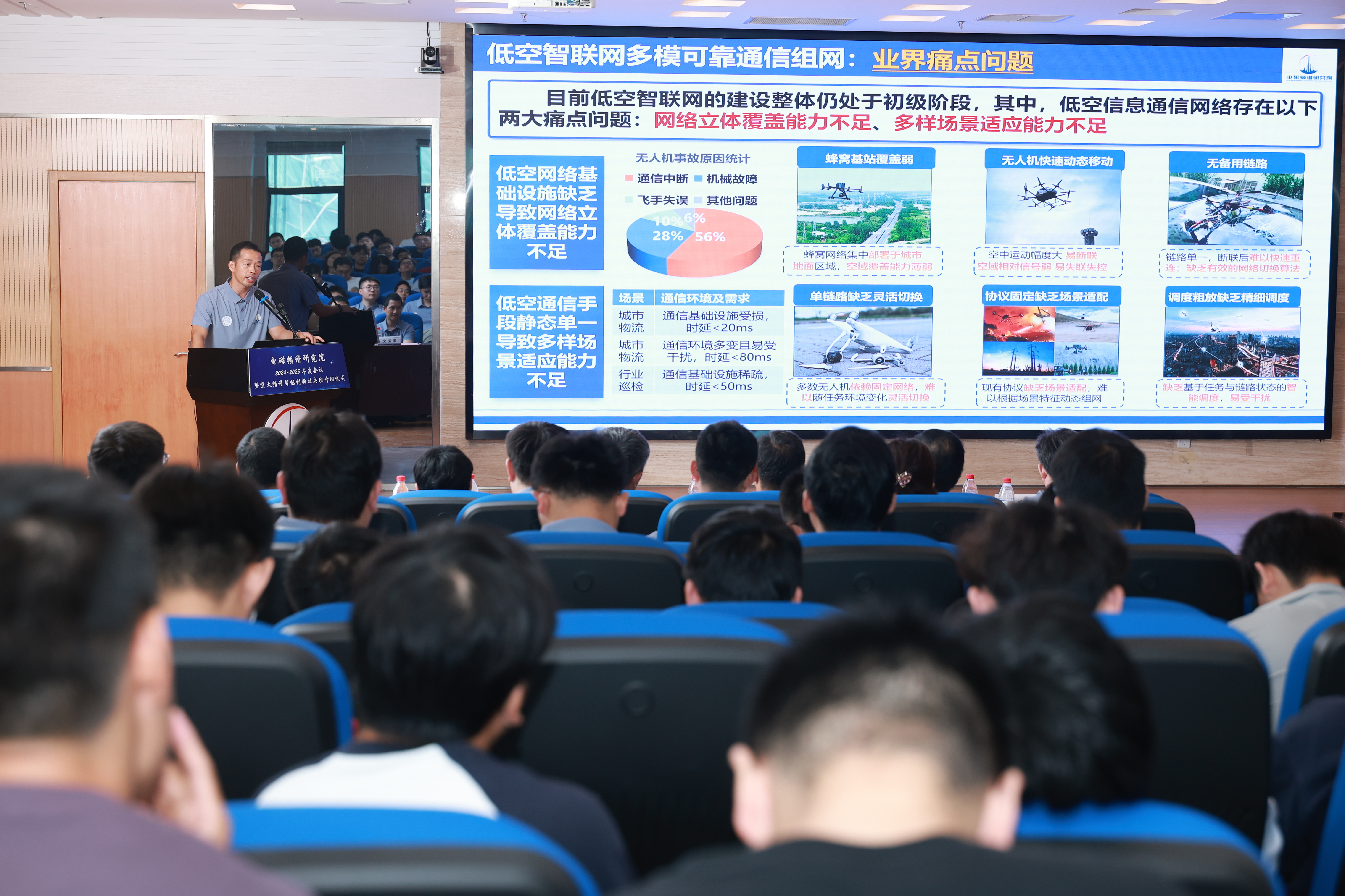 在随后的成果发布环节,认知网络创新中心主任屈毓锛副教授聚焦低空智联网多模可靠通信组网难题,分享了中心在架构设计与核心方法上的系统突破,该成果有效应对了规模化应用中的通信覆盖瓶颈,为低空经济的繁荣提供关键通信保障。认知孪生创新中心主任朱秋明教授分享了立体电磁频谱态势图方向的标志性工作,阐述了中心提出的先进认知方法,有力推动了对电磁空间动态变化的深度认知管理进程。认知定位创新中心主任李建峰教授介绍了在目标探测定位领域构建的创新体系,特别是自主研发的无人机载电磁辐射源测向定位平台,显著提升了在复杂电磁环境与广域范围对高动态目标的精准捕获与定位能力,服务于国家安全与频谱管理重大需求。