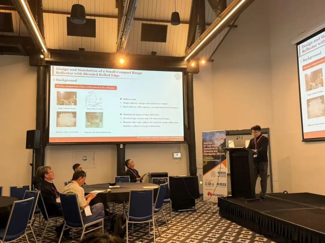 天线与空口测量课题组博士生李宠、夏文君的研究成果成功入选大会报告环节。他们自信从容地站在国际讲台,向全球天线领域的专家学者汇报最新研究进展,其工作的创新性和严谨性获得了与会者的广泛关注与积极讨论。指导老师徐千和邢蕾副教授也从国内表示由衷的祝贺。