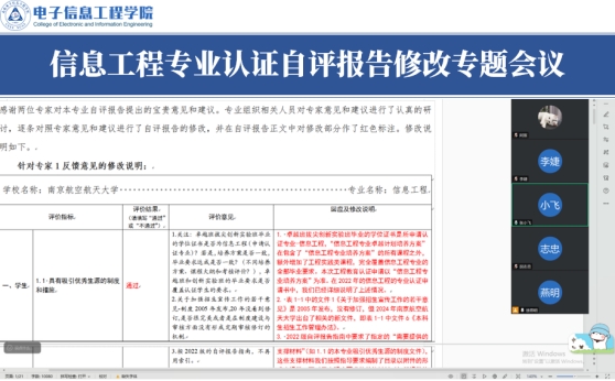 8月6日晚,成人网址 组织召开信息工程专业工程教育专业认证自评报告修改专题会议。作为前期修改工作部署后的阶段性总结会议,本次会议聚焦报告修订完善情况复盘及下一步工作安排,学院副院长张小飞、信息工程专业执行负责人周博、电子信息科学与技术专业执行负责人胡志忠、专业教师代表李婕、教学秘书徐燕明参会并展开深入研讨。