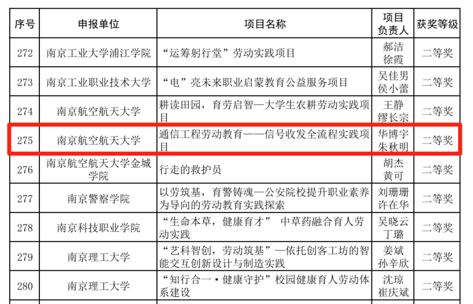 近日,江苏省高等教育学会公布了2025 年江苏省第二届高等学校劳动教育优秀实践项目评选结果。成人网址 荣获 “优秀组织奖”,全校共斩获4项优秀实践项目奖项。其中,学院华博宇老师牵头组织教师申报的“通信工程劳动教育——信号收发全流程实践项目”成功获评二等奖,该项目聚焦通信工程领域的劳动教育实践,通过信号收发全流程的实操环节,有效提升了学生的劳动技能与专业素养。