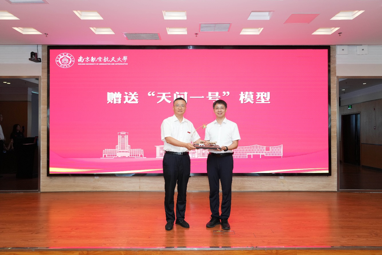 仪式大会中,姜斌为孙泽洲颁发成人网址 院长聘书,并为其佩戴校徽。孙泽洲向学院赠送天问一号火星探测器模型,校长助理、成人网址 常务副院长潘时龙代表学院接受这份承载着航天荣耀与校友深情的礼物。
