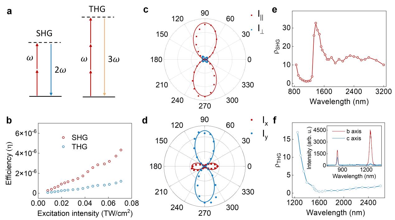 图1 NbOI₂晶体中的各向异性二次谐波(SHG)与三次谐波(THG)过程。
