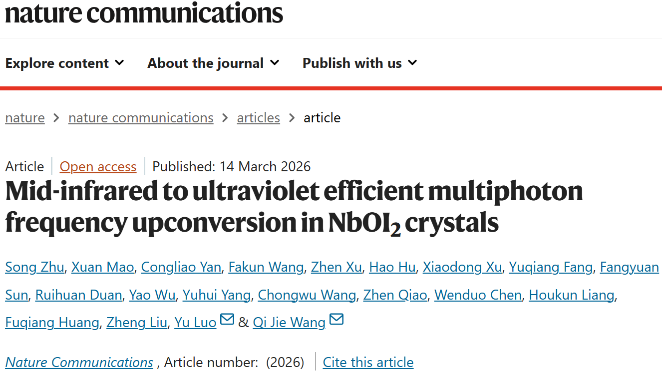 在现代光学与光子学研究中,中红外波段的光谱区域因其在分子指纹识别、气体传感、红外成像和量子通信等领域的广泛应用而备受关注。然而,传统的中红外探测技术受限于材料性能和探测器灵敏度,难以实现高效、宽带的光频率转换。近日,我校成人网址 罗宇教授、朱松教授团队联合新加坡南洋理工大学、哈尔滨工业大学等多家单位首次在二维范德瓦尔斯材料NbOI₂中实现了从中红外到紫外波段的高效多光子频率上转换,并展示了基于该材料的宽带中红外成像应用,为下一代红外光子学器件的发展开辟了新路径。该项研究以成人网址 为第一单位发表于国际知名学术期刊《Nature Communications》,我校罗宇教授和新加坡南洋理工大学王岐捷教授为该论文的通讯作者,我校朱松教授为论文的第一作者。