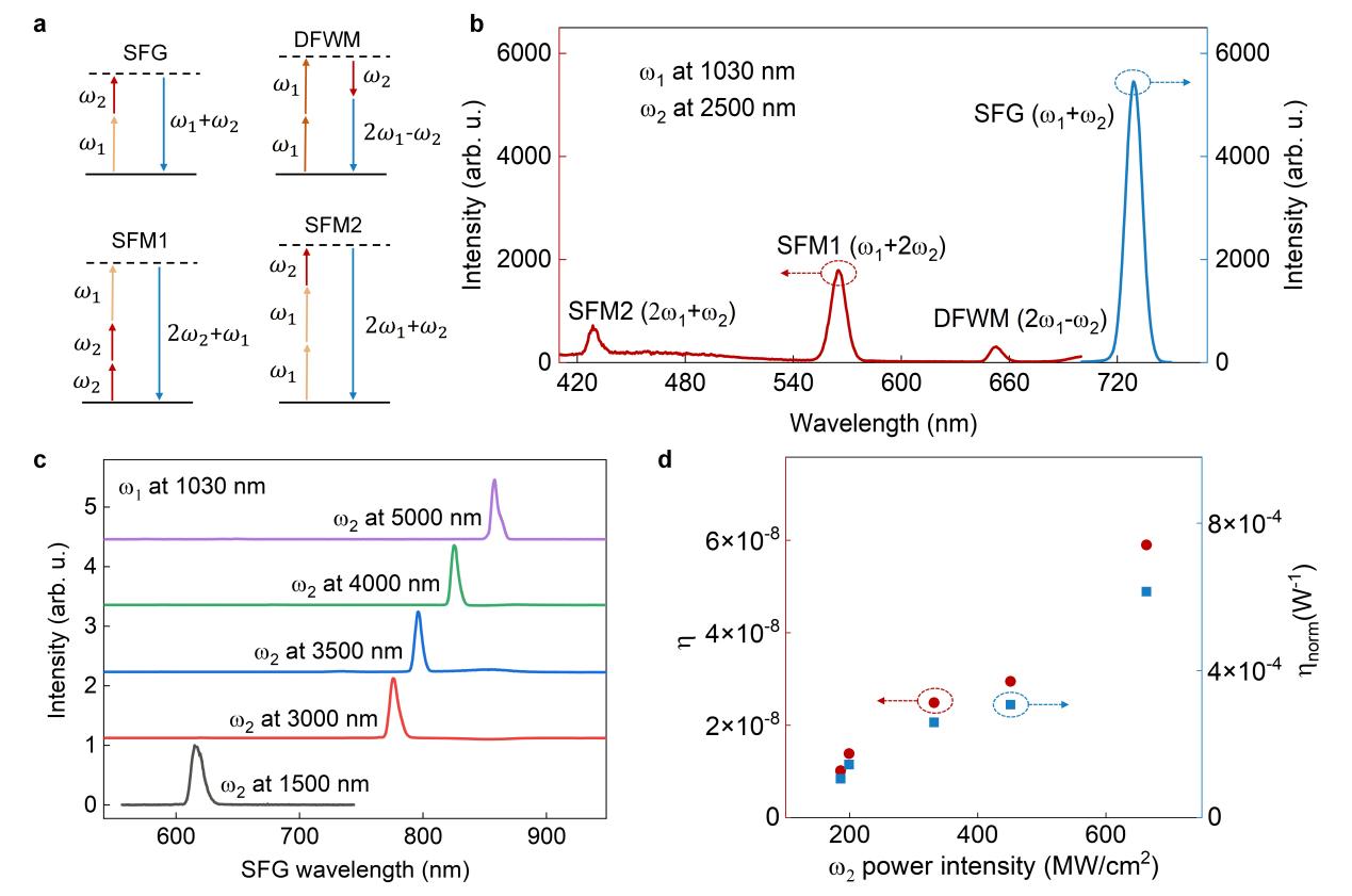 除了高次谐波产生,研究团队还进一步探索了NbOI₂在非线性频率混合中的表现。通过双光束激发方案(1030 nm固定波长与1500–5000 nm可调中红外光),他们在同一NbOI₂薄片中同时观测到了和频产生、简并四波混频、以及两种不同的和频混叠过程。这些信号覆盖了整个可见光范围(430–730 nm),且其转换效率高达6×10⁻⁴ W⁻¹,远超目前最先进的超表面平台。