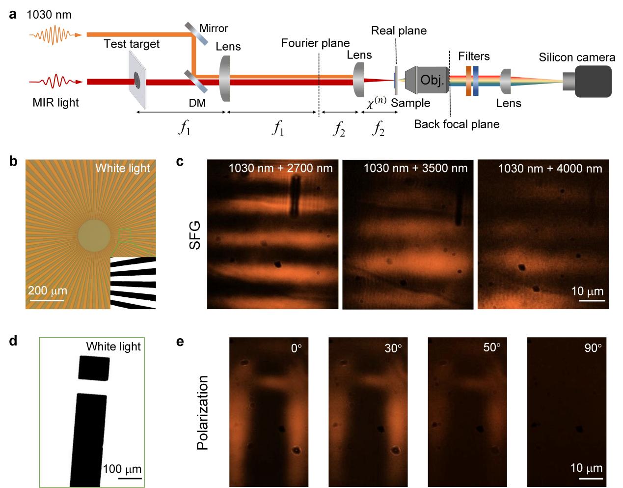 在实验中,研究团队将1030 nm的泵浦光与2700–4000 nm的中红外信号光共聚焦于NbOI₂薄片上,通过和频产生将中红外图像信息转换为可见光信号,并由硅相机直接捕捉。结果显示,不同波长下的图像清晰可辨,验证了该系统在宽带中红外成像中的可行性与灵活性。