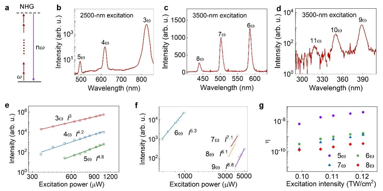 特别值得一提的是,研究团队还实现了七次、八次乃至十一次谐波的产生,且在低激发强度下即可观测到显著信号。例如,在3500 nm激发下,他们观测到了320 nm的十一次谐波信号,验证了NbOI₂在高阶非线性过程中的优越性能。